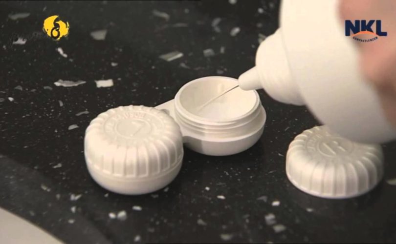 Het is aan te raden om je lenzenhoudertje ook te reinigen met contactlensvloeistof of fysiologische zoutoplossing. Nooit met kraantjeswater, want dan loop je het risico om besmet te raken met virussen, bacteriën of amoeben.